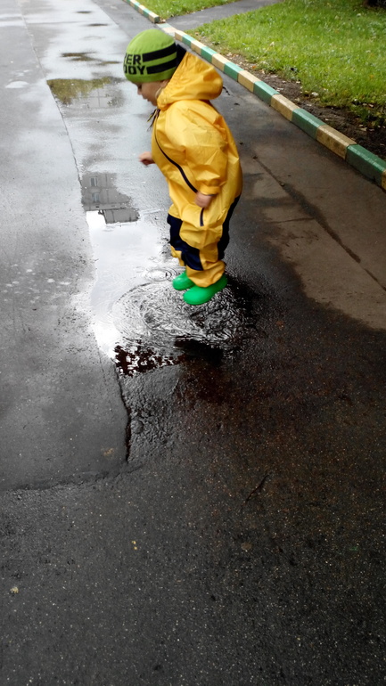 На ногах сапоги кроксы( они легкие и за счет бесшовности не протекают). Размеры у них на сайте подробно написаны, вам на год скорее всего размер подойдет. Я брала на размер больше, на фото видно, что рукава подвергнуты, но относил зато два сезона.