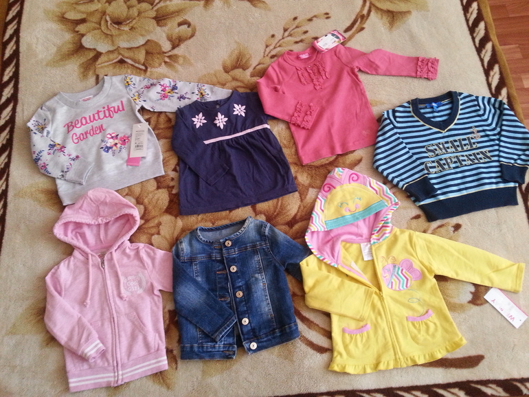 розовую олимпийку и джинсовку носили тем летом,продолжим и этим,они по 149,розовая кофточка и желтая куплены когда дочке было 6 мес.Полосатый свитер-это вещь сына, как думаете,девочки,нормально будет если на дочку его надеть?