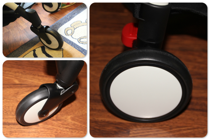 Они достойны отдельного внимания... Потому что действительно красиво смотрятся цельные диски. Передние колеса поворотные - НЕ фиксируются. Правда ширина колесной пары плохо совместима с Московскими паднусами - я пока видела только два по которым мы смогли проехать, в остальном - все широкие. Но при этом коляска неплохо "шагает" по ступенькам. Если же рядом любимый МУЖчина, то можно спустить поднять ее более варварским способом - на широких МУЖских плечах.