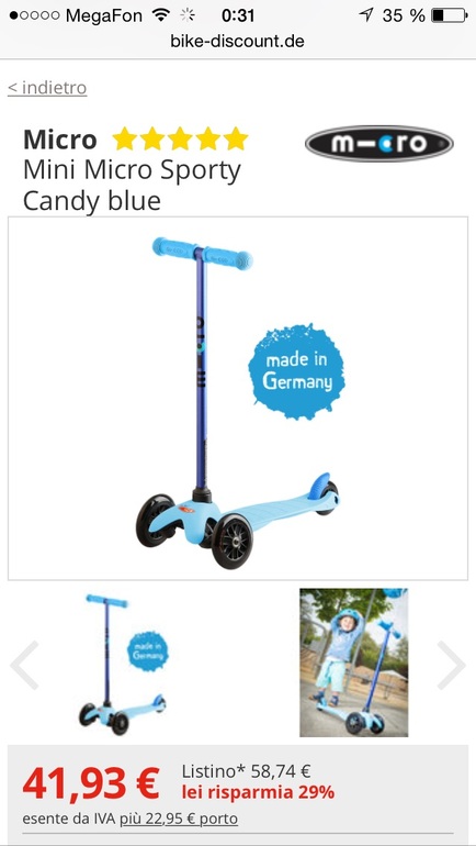 Девушки, добрый день, хочу составить вам компанию в покупке мини микро, но мне нужна модель Делюкс (там регулируется высота ручки). На немецком сайте таких нет в наличии. Предлагаю заказать на австрийском https://www.kiddy-bikes.at/ . Та м вроде и цена выгоднее