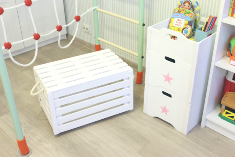 В этих ящиках со звездочками хранится деревянная "железная" дорога и наборы лего дупло, верхний ящик в основном для того, чтоб набрать в него нужного добра и унести играть в гостиную. Большой реечный ящик тоже возится по квартире вместе с содержимым.