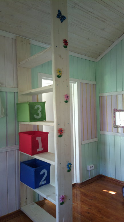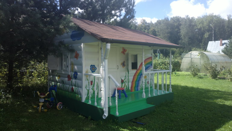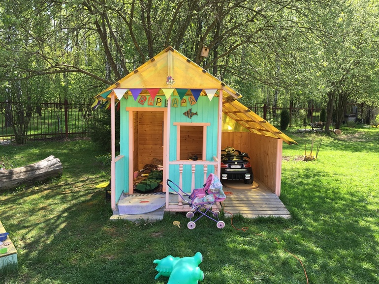 Вот, нашла вид сбоку)) внутри лавка и столик, игрушечная кухонька. Дверь сняли, потому что на деле постоянно прищемляли друг другу пальцы)) повесили занавеску) и на окошках тюль от комаров