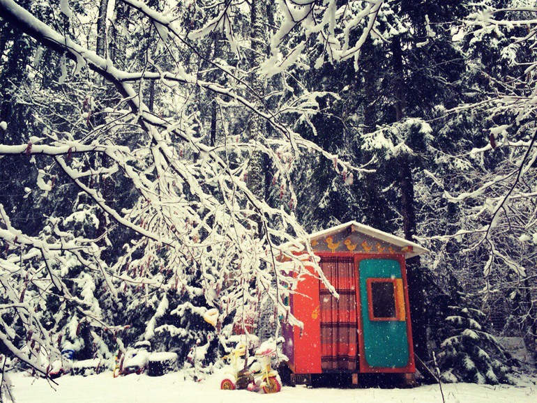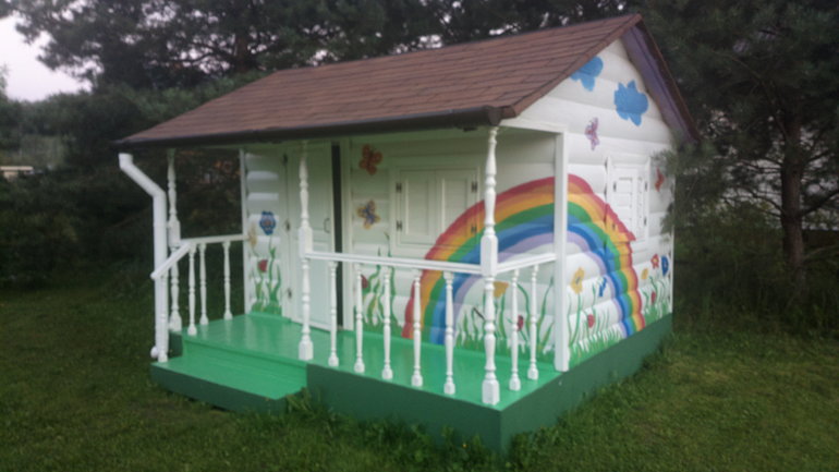 Строили своими силами. Расписывала снаружи я. Мебель внутри, в основном, тоже самодельная.