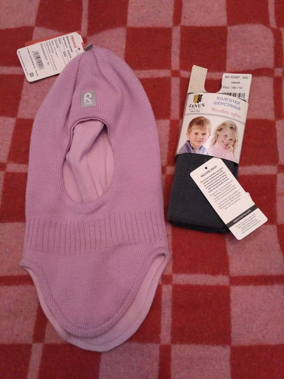 Шлем и колготки навырост. Сейчас носим такой же шлем, но другого цвета, 48 размер. Взяла 50. Обошелся в 800 рэ. Колготки шерсть 70%, 30% синтетика Янус- очень советую! В декабре брала по полной цене- за 1000. Сейчас за 650. Качество очень понравилось. Цвет вживую бледнее. Брала еще для сравнения родные мазакеевские, они тогда были дешевле, около 800 рэ. Сейчас их нет совсем. Но они пошли крупными катышками, к сожалению.