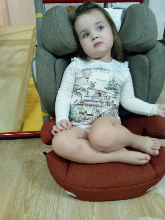 У нас нет возможности наклонить кресло, тк у сиденья спинка не двигается. Второй раз дочка засыпает, голова падает и висит. Подкладыапла сегодня спереди шапку,чтоб не болталась