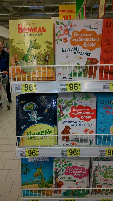 Репортажи из магазиновСерия книг про медвеженка Боба и про динозаврика Урмель. На фото не все книги видно. Это в Ашан Братеево, но думаю, во всех они есть.