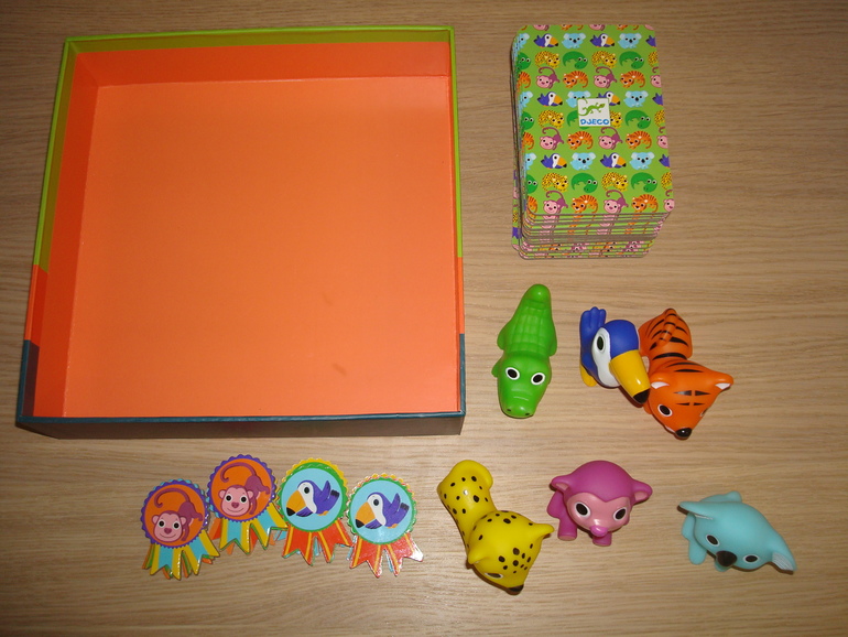Начало игры. Поставьте 6 животных в центре стола. Рядом поставьте нижнюю часть коробки и положите медали. Перемешайте карточки и положите их стопкой лицевой стороной вниз рядом с коробкой.