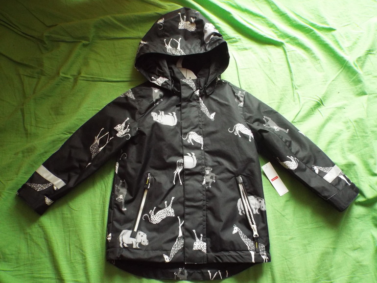 Ветровка Lindex без всяких утеплителей на гладкой подкладке. Хоть и черная, но за счет светлых зверей достаточно яркая.