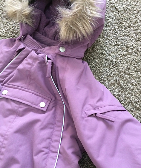В районе груди комбинезон закрывается сначала кнопками, затем застёгивается замочками. Шея закрыта получше, чем в Wheat. Но если ребенок носит шлем, то это различие не имеет значения.