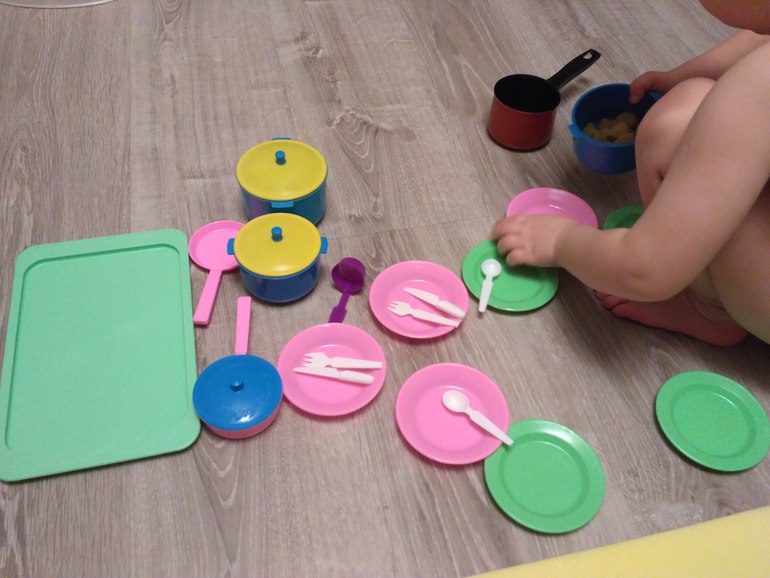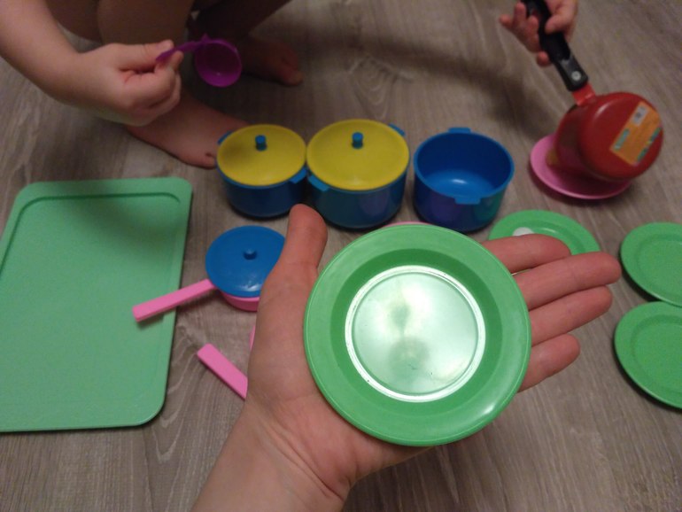 Набор привлёк ценой по акции. Оказалось в нём аж 3 кастрюли, сковорода, сковорода для блинов)(чуток к Масленице не успели))), 7 тарелок, почему-то приборы на две персоны, т.е. гостей не ждём))) и поднос. Посуда довольна крепкая, а приборы и половник хлипенькие. За такую цену набор хорош. И немного фоток, для того, чтобы размер понять.