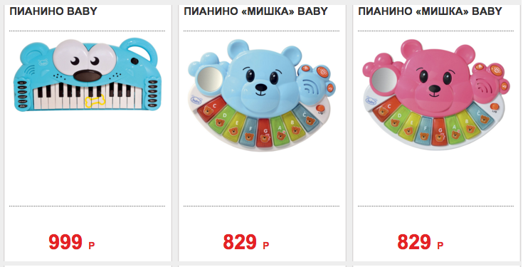 У нас уже два года игрушка-пианино из кораблика. Называется "Поющие друзья". Крепкое, в меру громкое. Подобное пианино-синтезатор"Маша и медведь" быстро развалилось под натиском годовалого ребенка.