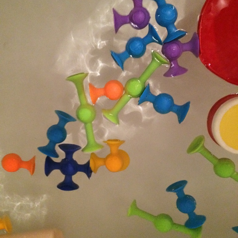 пазл из эва из фикс прайса намочить и приклеивается к кафелю - собирает, краски пальчиковые + большая кисточка, мелки для кафеля, мыльные пузыри, рыбалка с сачком и всякие пузырьки.