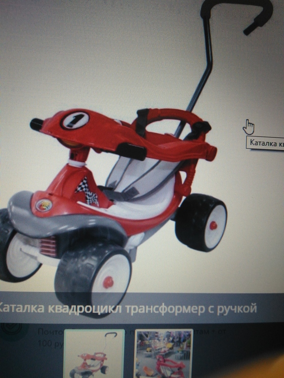 Бывают машинки-каталки с ручкой (которая как у квадроцикла вашего), почитайте про них отзывы, у нас на площадке такая была у мальчика, удобно что ребенок когда накатался сам, мама может его довести потом домой с помощью ручки. Машинка-каталка нужна однозначно, ребенку нравиться, он развивает ноги, навыки управления транспортом, противопоказаний от врачей (на по крайне мере) нет.