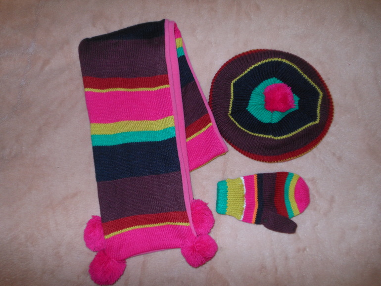 И вот еще покажу красивущий комплект, мимо которого я не смогла пройти на распродаже. Дочке невероятно идет эта шапочка. Но когда ж его носить? Шапочка тонкой вязки, без подклада, на теплую весну- прохладное лето. Шарф на флисе!!! И варежки плюсом)))) Но у Франческо Донна такое частенько) Ну да ладно, что-нибудь придумаем)