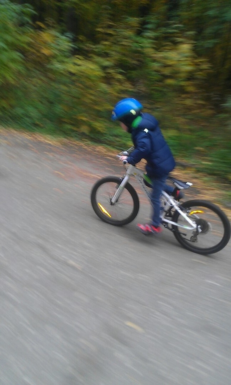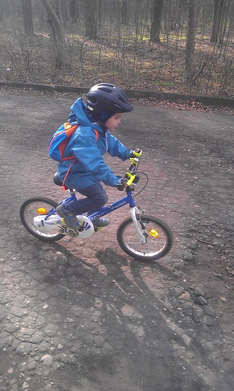 Обгоняет всех сверстников на стадионе , еще умудряется ехать вровень с ребятами 10-13 лет . Еще рулит одной рукой . и даже пытается без рук (за что конечно ругаю . но все же попытки есть ). Еще очень классно спрыгивает с велика. т.е. велосипед еще едет - а он крутит попой - и обе ноги налево , и во время движения спрыгивает . Короче он меня настоящий велосипедист . По школьному стадиону он может кругов 20-30 наматывать , и его оттуда не утащить.