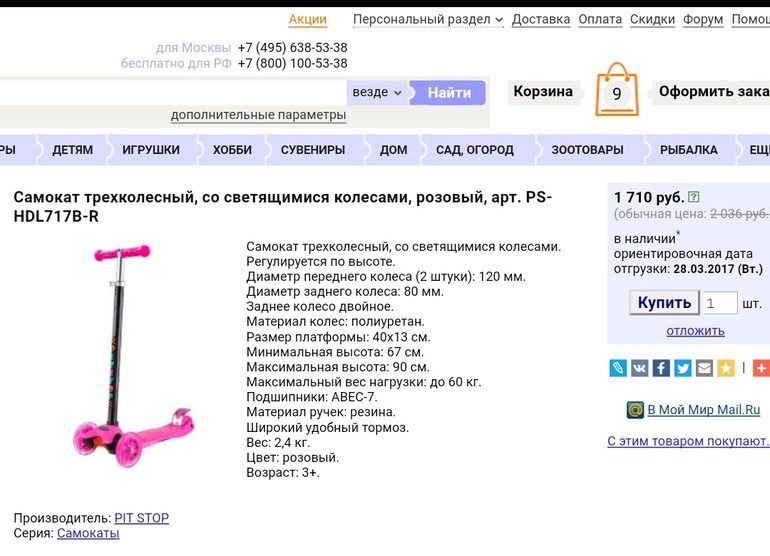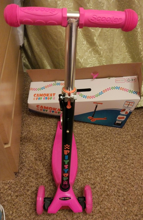Спортивные товары. Велосипеды, самокаты, машины. СанкиДоброе утро. Выбирала дочке самокат и наткнулась в май-шопе на pit stop. Отзывов не нашла и решила рискнуть. В этом самокате меня привлекли светящиеся колеса и подшипники abec7. Просматривая множество вариантов у меня вообще сложилось мнение, что все на одном заводе сделано, только наклейки разные. Самокат понравился, едет плавно и бесшумно, на вид крепкий. Высота самоката от 67 до 90 см. Пластик глянцевый. До этого у нас был самокат с матовым пластиком, выглядит он конечно благороднее.