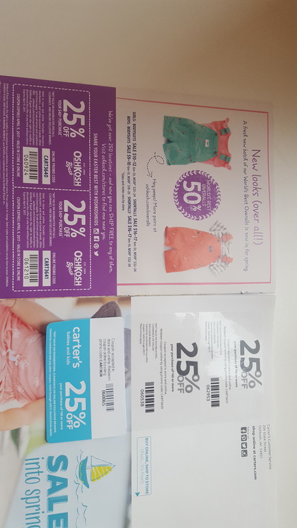 Личные скидки ( не распространенное)Есть 5 купонов на 25% скидки в картерс. В онлайне указывается промокод с картинки.
