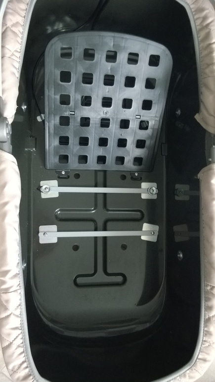 + Съемная люлька. Ее можно использовать при укачивании малыша. Такая функция нам очень пригодилась. Поля некоторое время засыпала очень плохо, а у мамы есть дела по дому, поэтому ставлю ее на балкон. Затаскивать шасси на балкон каждый день не удобно, закатывать тоже, т.к. у нас дверной проем на балкон четко по размеру разложенного шасси. Несколько раз я ее закатывала на балкон, и в итоге отломала заглушки на колесах и испачкала дверь в смазке. Люльку можно зафиксировать в устойчивом положении на ровной поверхности, и использовать первое время вместо кроватки. Но в этом случае считаю необходимым иметь дополнительный самодельный внутренний чехол или просто застелить все пеленками. Все же использовать будете и на улице. Люлька удобна еще тем, что при посещении гостей с животными, ребенок может играть и спать в ней, мы так и делали.