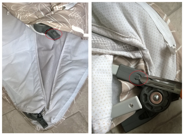 + Съемный капор-капюшон. Чтобы его снять с люльки нужно надавить на замок (обвела красным), сделать это легко. Легко снимается и сам чехол капора, нужно аккуратно подцепить фиксатор и вытянуть дуги. В инструкции это не указано. Я снимала для пришивания отражалки и стирки. Так же легко защелкивается обратно.