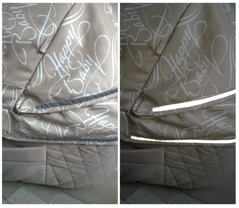 - Нет отражающих элементов. Сейчас во многие детские вещи вшивают отражалку, что очень правильно. На многих колясках почему-то ее нет. Жаль((( Коляска куплена б/у за не большие деньги. Поэтому первым, что я сделала, то это пришила по периметру светоотражающую ленту. Общий вид коляски, на мой взгляд, я не испортила. Считаю, это очень важным элементом, так как мы стали сразу заметнее на пешеходном переходе, особенно в вечернее время. Приклеивать или обвешивать коляску съемными отражателями не хотелось.