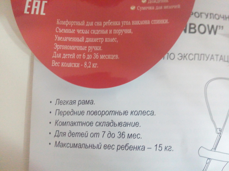 По весу заявлено 7,4 кг, но инфошка разнится. Смотрите сами. Чему верит не знаю, не взвешивала. Но коляска реально легкая.....