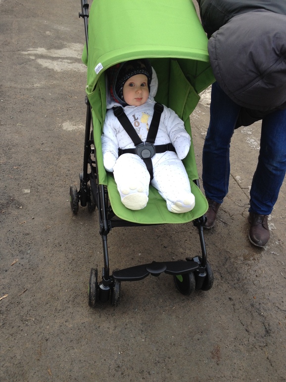 Ну вот сейчас апрель, мы в легкой куртке и полу комбезе (закрывает грудь и на лямках). Но так как местами прохладно, то надеваю пинетки шерстяные. Обратите внимание, что сейчас нам 6 мес, мы носим р 74 у верхней одежды, а слипы р80 нам уже впритык. Так что комбез/конверт на зиму я советую брать минимум 74-80р! Из-за объема одежды под низ