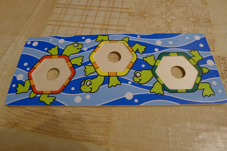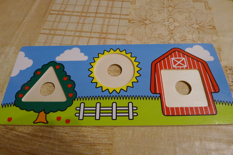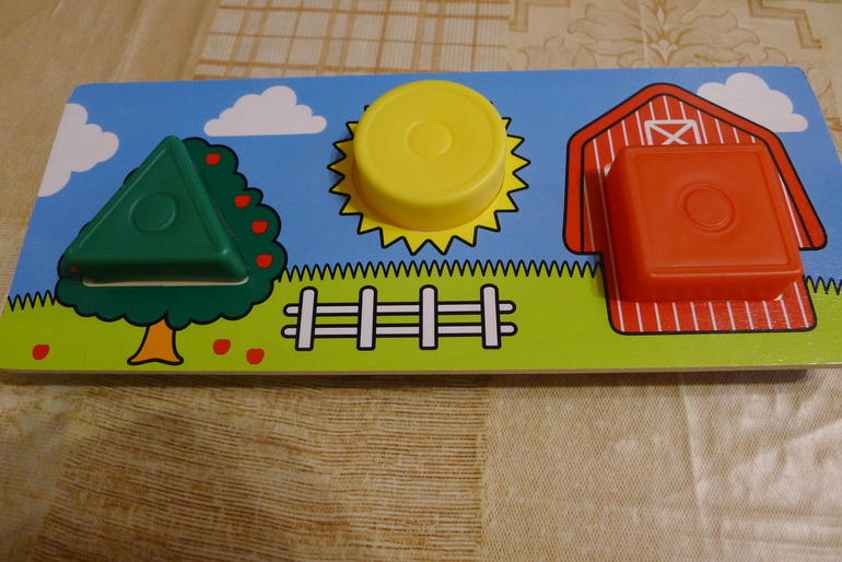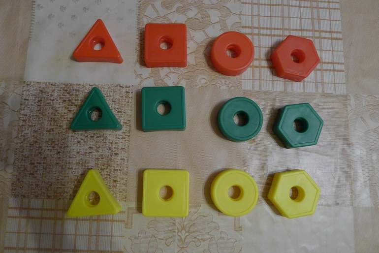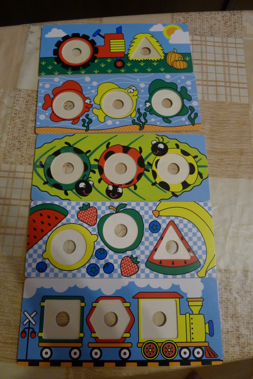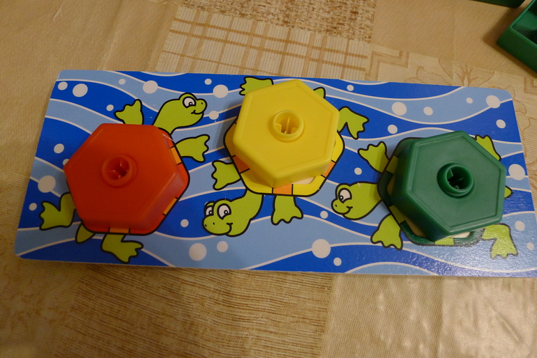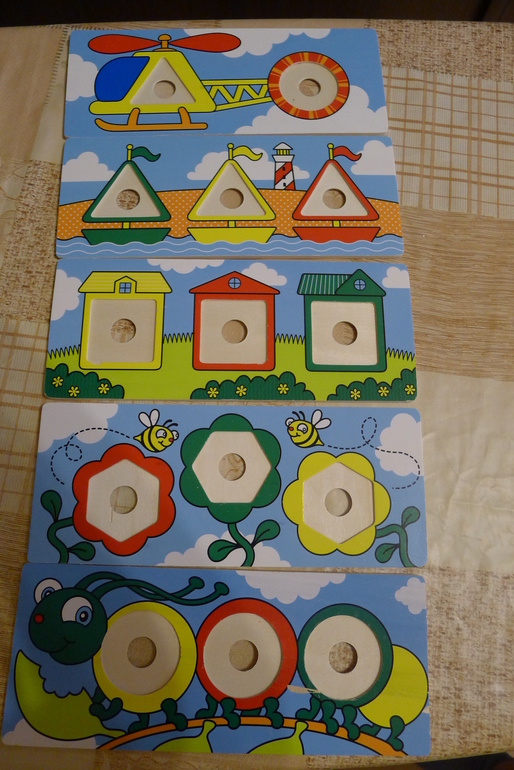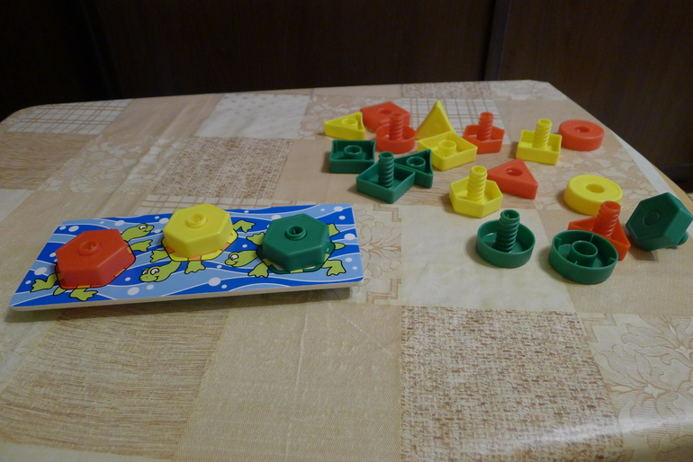 Даны пластмассовые винтики и гайки разных цветов и форм. И к ним прилагаются дощечки с двусторонними рисунками и выемками для винтиков с гайками. Нужно с помощью винтиков и гаек закончить картинку, подобрав правильно по цвету и форме.