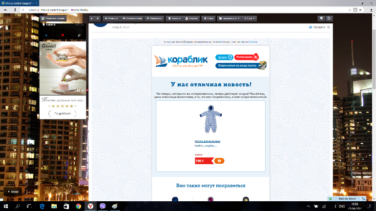 Интернет-магазины России и стран СНГПодскажите, пришло письмо из кораблика и там цена на костюм со скидкой тип, я подумала а может не ждать лессии да и взять баркито за такие то деньги! (тем более у нас ветровка точно такая, я довольна) Захожу оформляю, цена выше....то ли я не знаю, как еще сбить цену...то ли это просто замануха-развод)))))))