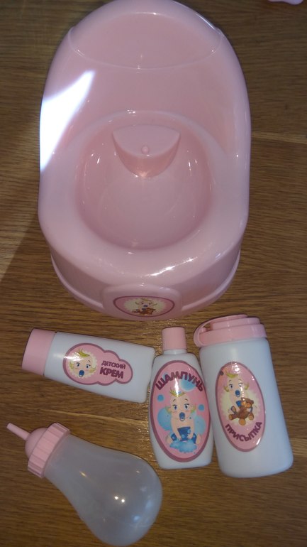 И вот такой набор для ухода за пупсом,в комплект входит детский крем,влажные салфетки,мыло и мыльница,памперс,бутылочка и пустышка,присыпка и даже баночка сухого молока