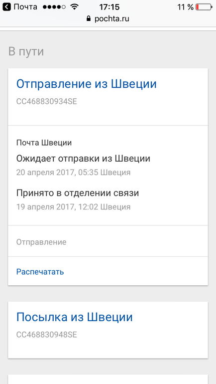 Пытаюсь отследить, а отслеживается только одна😭😭😭😭😭... хотя изначально они обе были в ожидании отправки из Швеции... что же делать????? Вот такая картина отслеживания на почте России...