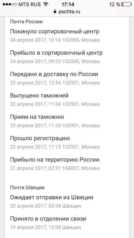 У меня на сайте почты пишит,что ожидается отправки со Швеции, а я ее уже получила ) мне они прислали письмо ,что какой то сбой и т д ,и что посылка моя уже ждет меня .