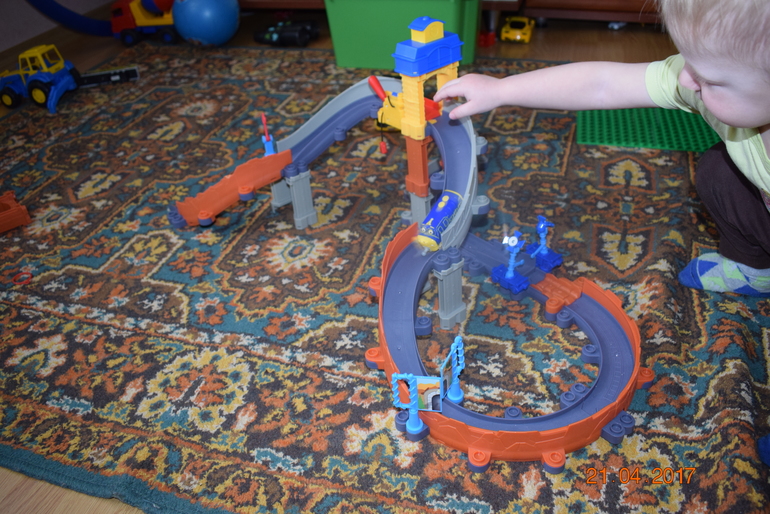 это два набора чагингтон соединили. честно я противилась им, т.к. полно других трасс, но детям понравился, можно моделировать новые треки и спускать не только паровозики, но и машинки типа хот вилс! для нас + что вместо рельсов обычная дорога. Никита большой фанат паровозов!