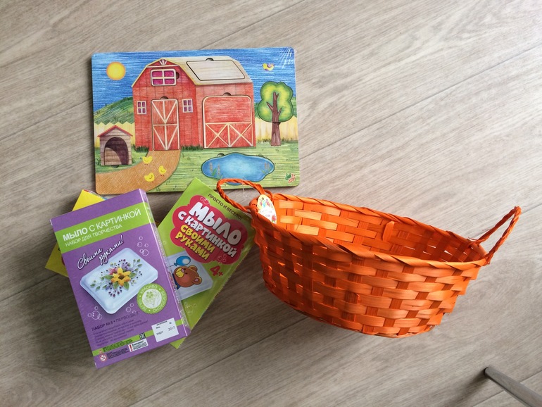 Сейчас после сада заезжала, купила разные наборы мыла с картинкой своими руками по 49 р, рамку-вкладыш племяннику, и пару кофт для дома по 99 р. Корзинка плетёная 29 р: