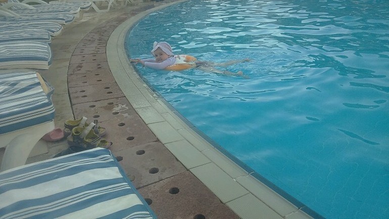 О, понятно. Она руками пытается грести в ванной когда на пузике "плавает". Походим первое время вместе с мужем, он скорей её научит правильно себя в воде вести))