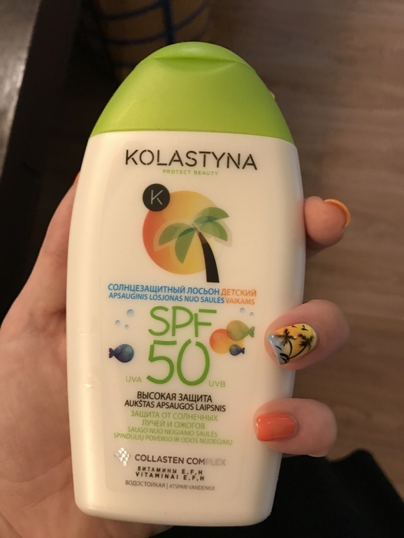 Я брала Garnier детский и Моё солнышко, так вот второй мне понравился больше. Наносится легче, белых следов не оставляет и отстирывается от одежды легче. Но на пляж я бы рекомендовала купить плавательный костюм