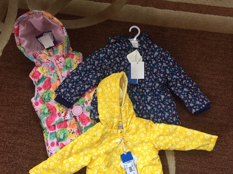 Детский мир: за все 2200, желтая курточка 86 размера на ребенке ростом 78 хорошо, небольшой подворот на рукавах, жилетка размер 122 на ребенка ростом 116 села хорошо, ну и синяя размер 92 навырост