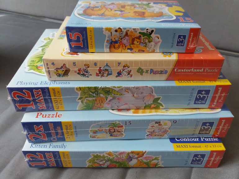 6. Пазлы. Много больших пазлов. Но пока эти дочке тяжело собирать. Но из 2 и 3 частей очень легко. Поэтому пусть трудится