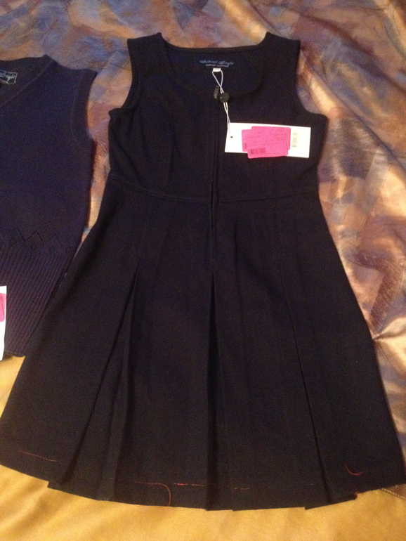 сарафан синий 128 и 134 по 200р и 300р водолазка в центре 149р блузка трикотаж. из дм 300р и колготы из окей 67р