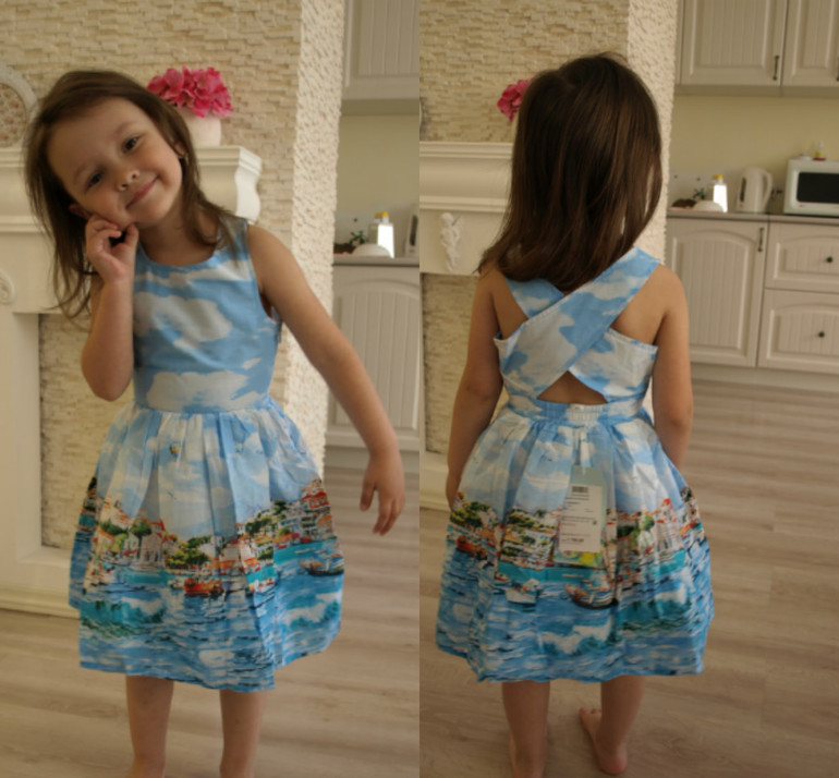 Платье с маками оказалось из плотной ткани 98р. Голубое тонюсенькое 104 (немного маломерит), сзади спинка классно сделана. Кстати оно еще есть во всех размерах на сайте. И сейчас там распродажа 6 вещей по цене трех.У модели рост 98см: