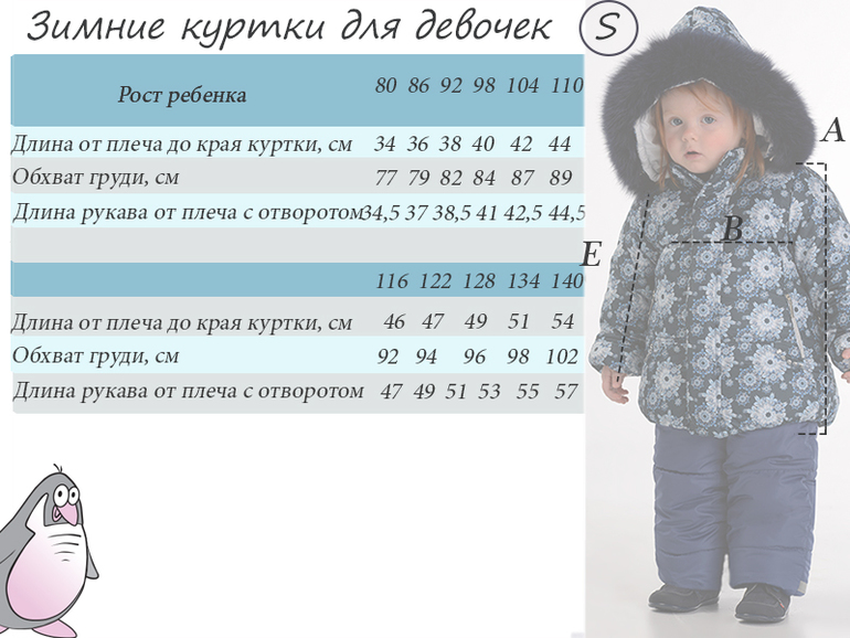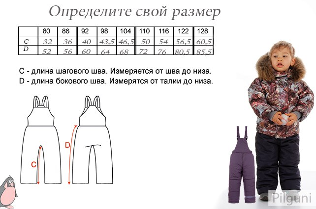Посмотрите какие размеры курток у Pilguni Пилгуни, производят 2 фасона курток для девочек в разных принтах. Поэтому легко определить длинну куртки,один покороче, другой подлиннее. Есть на изософте до минус 30 и со съемной подстежкой и овчины до минус 35. Брюки фасон стандартный можно подобрать любой цвет.
