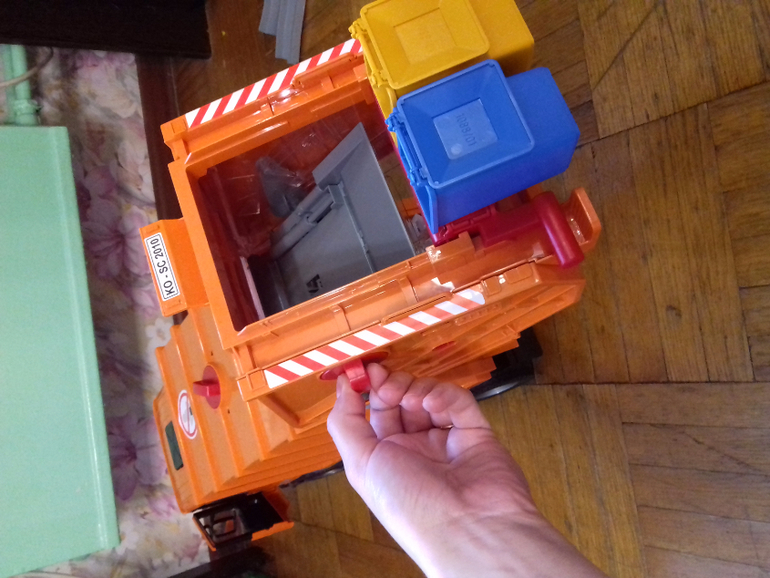 Очень реалистичная машина. Механизмы: переворачивает контейнеры, сгребает мусор внутрь, выталкивает наружу.