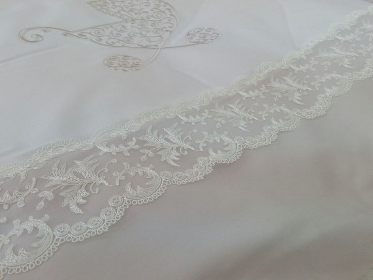 У сына комплект Инфанты Лапетти с вензелем, такого же цвета. В идеальном состоянии,несмотря на регулярные стирки (на бережном режиме). Гладится хорошо. Завязки пришиты очень крепко, ни одна не оторвалась. Тоже увидела и влюбилась, купила еще до рождения сына)))