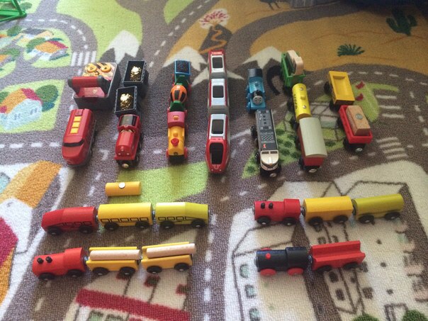 У нас уже 5й год икеа+ брио+ с али Томас, Чаггингтон и неизвестная. Вообще все деревянные жд дороги совместимы (те потом можно будет рельсу взять и поискать по магазинам - Вуди, Балби). Сын до сих пор периодически играет, и гости приходят и играют даже 8летние. Лего дупло тоже было много и сын любил его, и сейчас любит лего. Но жд принципиально лего не хотела покупать. Поезд самоходный Брио пока не нужен, в таком возрасте у ребенка велико желание самому приводить его в движение, а не смотреть как он ездит, они ломаются от этого. Били у них с переключателями от батарее/руками, если сейчас есть, то можно его. У нас в основном сын в таком возрасте играл поездами без батареек, с батарейками под присмотром и не надолго его хватало наблюдать