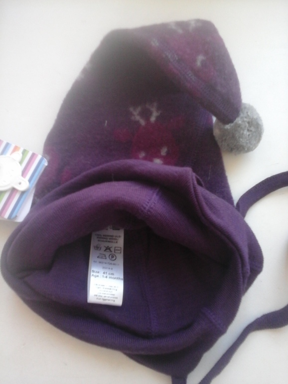 Первый на хлопковой подкладке плюс плетение двойная нить, 95%шерсти, размер 41(на этикетке 1-4мес), 215руб. Очень мягкий, плотный, но и тянется хорошо, думаю и зимой можно под капюшон.