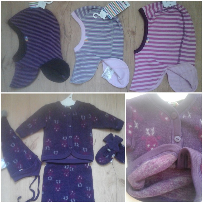 Всё 60 размера(56/62 на этикетке), шапочка 41 размер (1-4мес). Шерстяной флис, 100%шерсть мериноса. Очень мягкий материал, толстый, точно будет очень тепло)