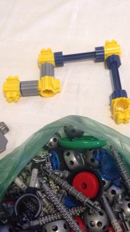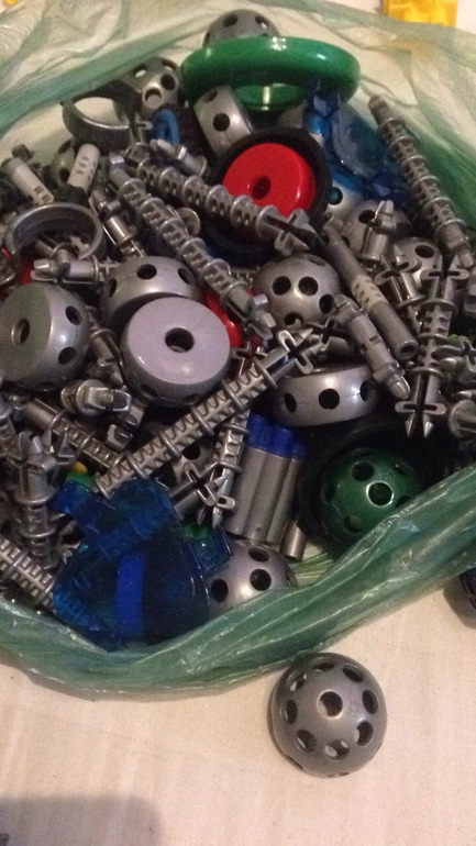 Не опознали? Разложите несколько разных деталей на столе, чтоб лучше на фото видно было, какие они. Вот синие совсем не понятно. Небанальный конструктор. Что же это такое?