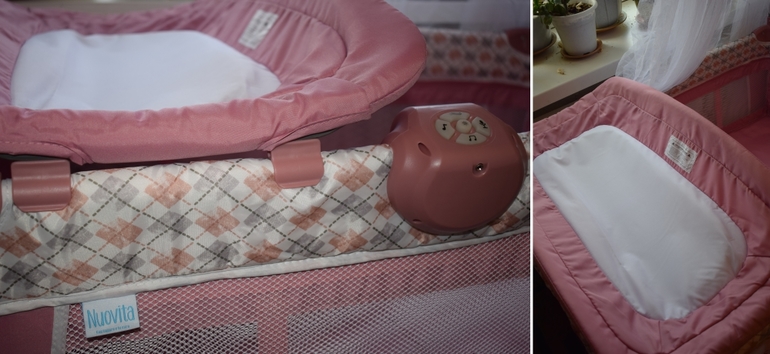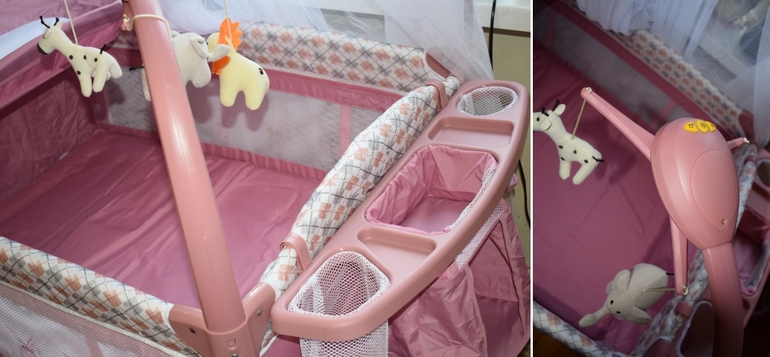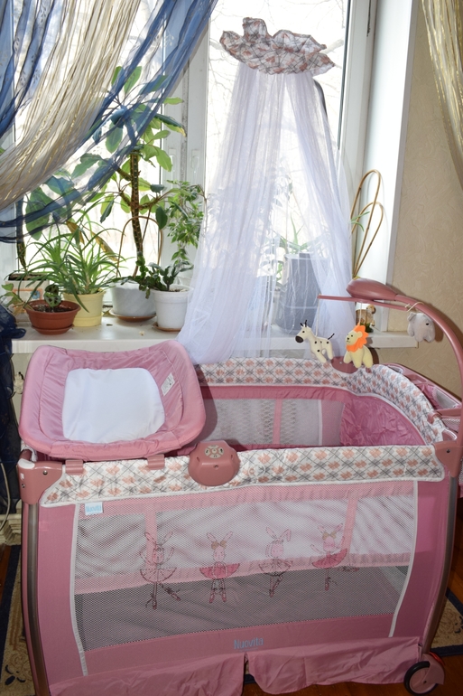 Через эту сетку она, если потребуется, видит маму с папой и ей всегда спокойно. Мне тоже не надо подходить каждый раз к манежу, чтобы посмотреть, как она там спит. Этот манежик очень удобный, он и манеж, и кроватка одновременно, тут даже есть съемный пеленальный столик. Я им часто пользовалась, когда необходимо было сменить подгузник. В нем все продумано, скажем сбоку есть карманы для детской косметики и большие отделения для памперсов. Правда эти карманы не съемные, они отсоединяются вместе с пластиковой подставкой и если нужно постирать, можно приловчиться и стирать все вместе. Но если все делать правильно и не ставить испачканные предметы в кармашки, то и стирать особо не нужно.