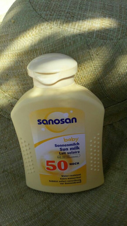 Молочко Саносан 50+, безопасный состав без парабенов и консервантов. Для детской чувствительной кожи самое то. Можно использовать практически с самого рождения.