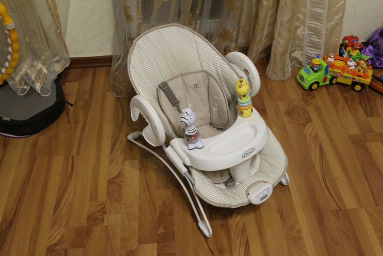 Были такие, только зеленые, остались довольны. Новорожденного не желательно туда класть, а потом без них никуда. Вибрация от колик помогала, на кухне готовила, а ребенок в них качался или игрушки вешала и он играл, прикорм в них первый был. Переносить можно шезлонг прямо с ребенком. Укачивали иногда в них, когда уже спина не выдерживала.