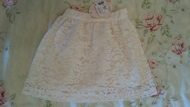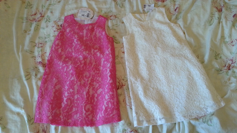 В магазине еще со скидкой 90% видела платья немного других фасонов, комбинезоны с шортиками и блузочки с коротким рукавом, всё из такой же ткани. Размеры от 98 до 140 (самый большой какой попался). Кружево вообще неплохое,в жизни хорошо смотрится, подкладка хлопок.